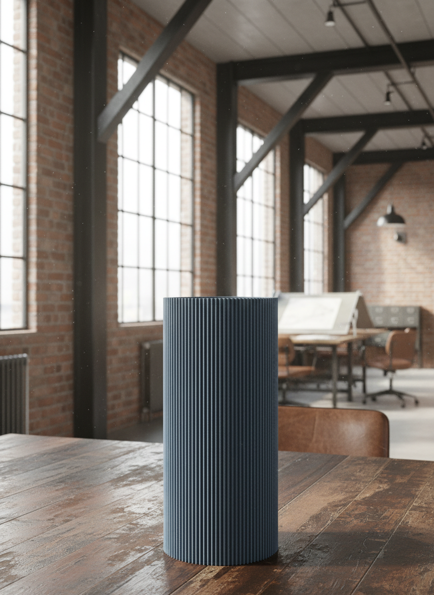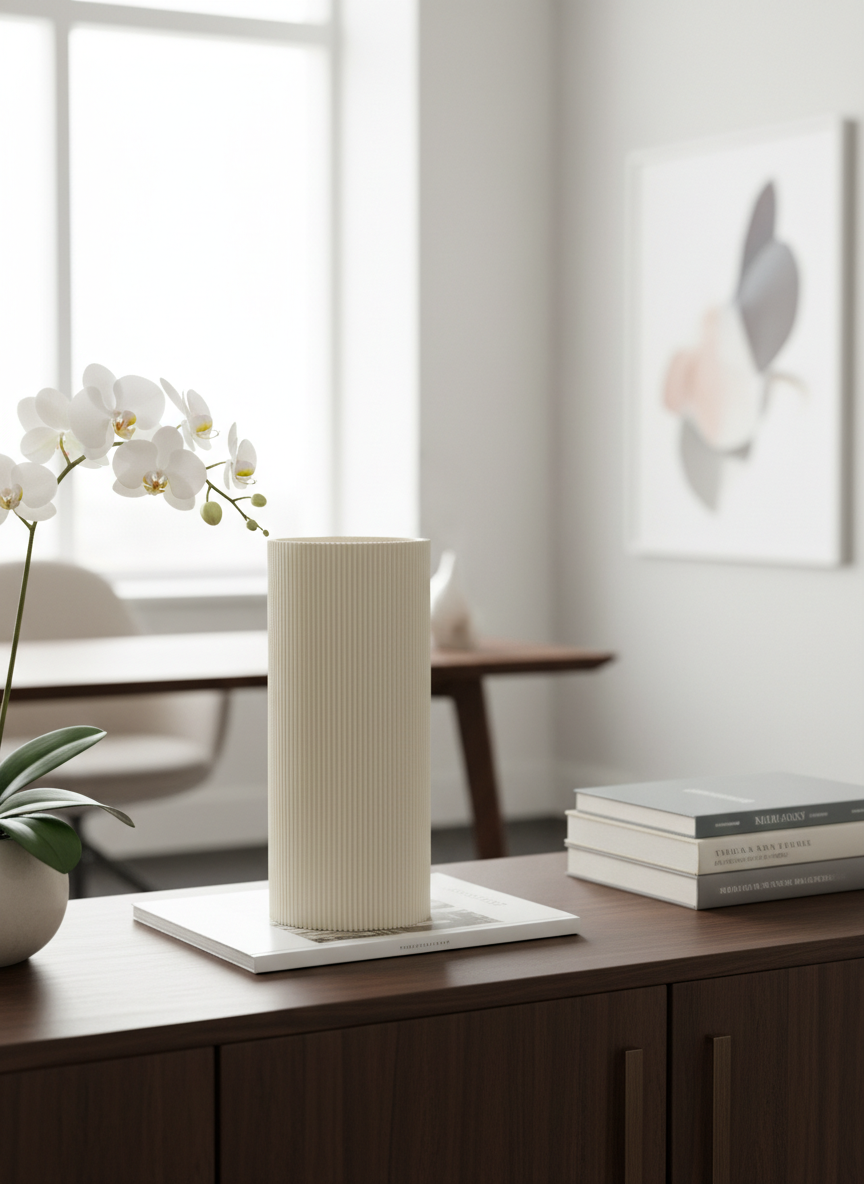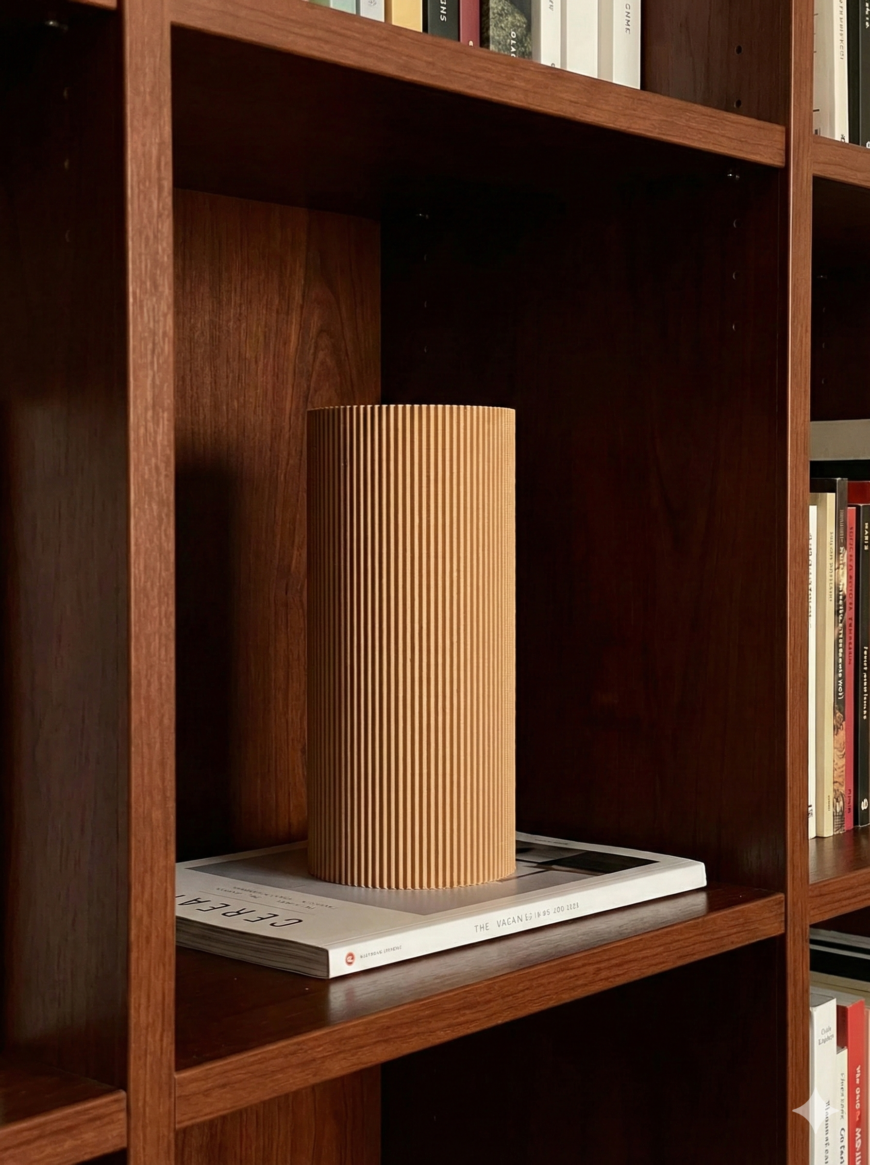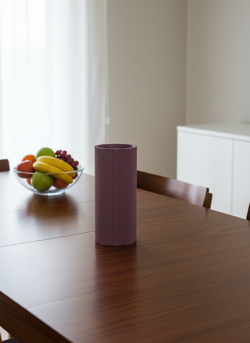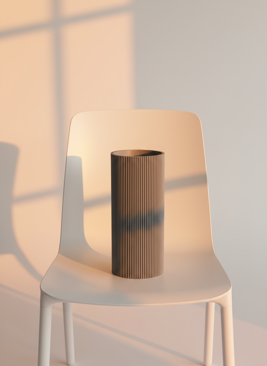 Die zylindrische Silhouette trifft auf eine fein geriffelte Oberfläche, die durch präzisen 3D Druck entsteht. Die sichtbaren Layer erzeugen eine elegante vertikale Struktur, die Licht und Schatten auf faszinierende Weise reflektiert.