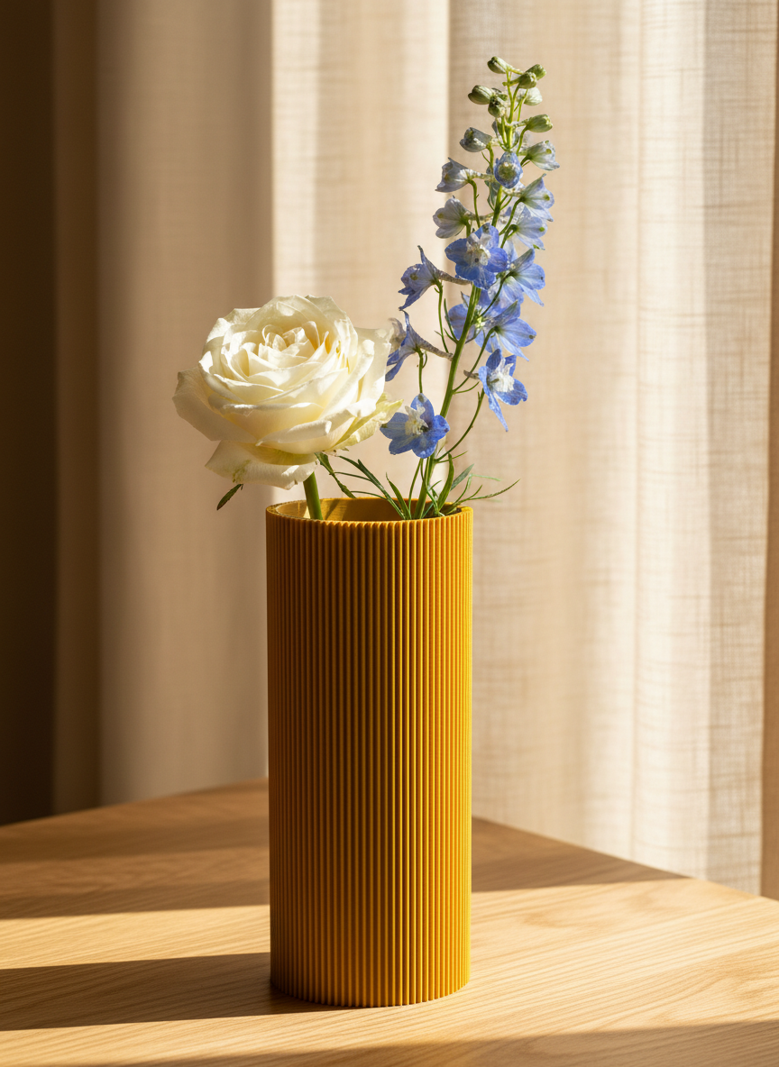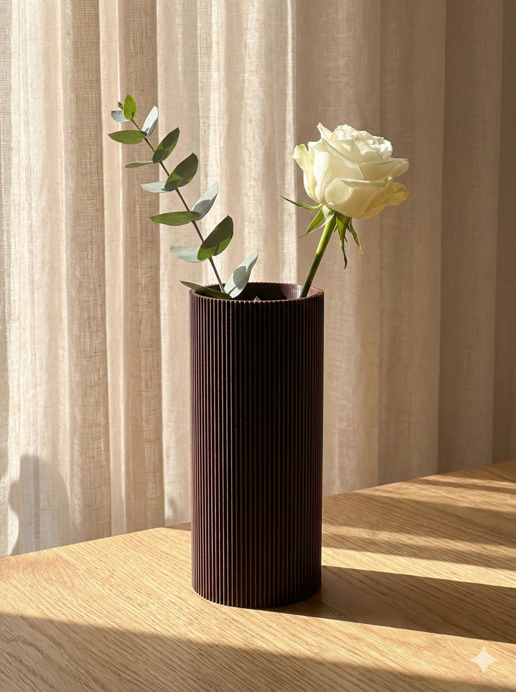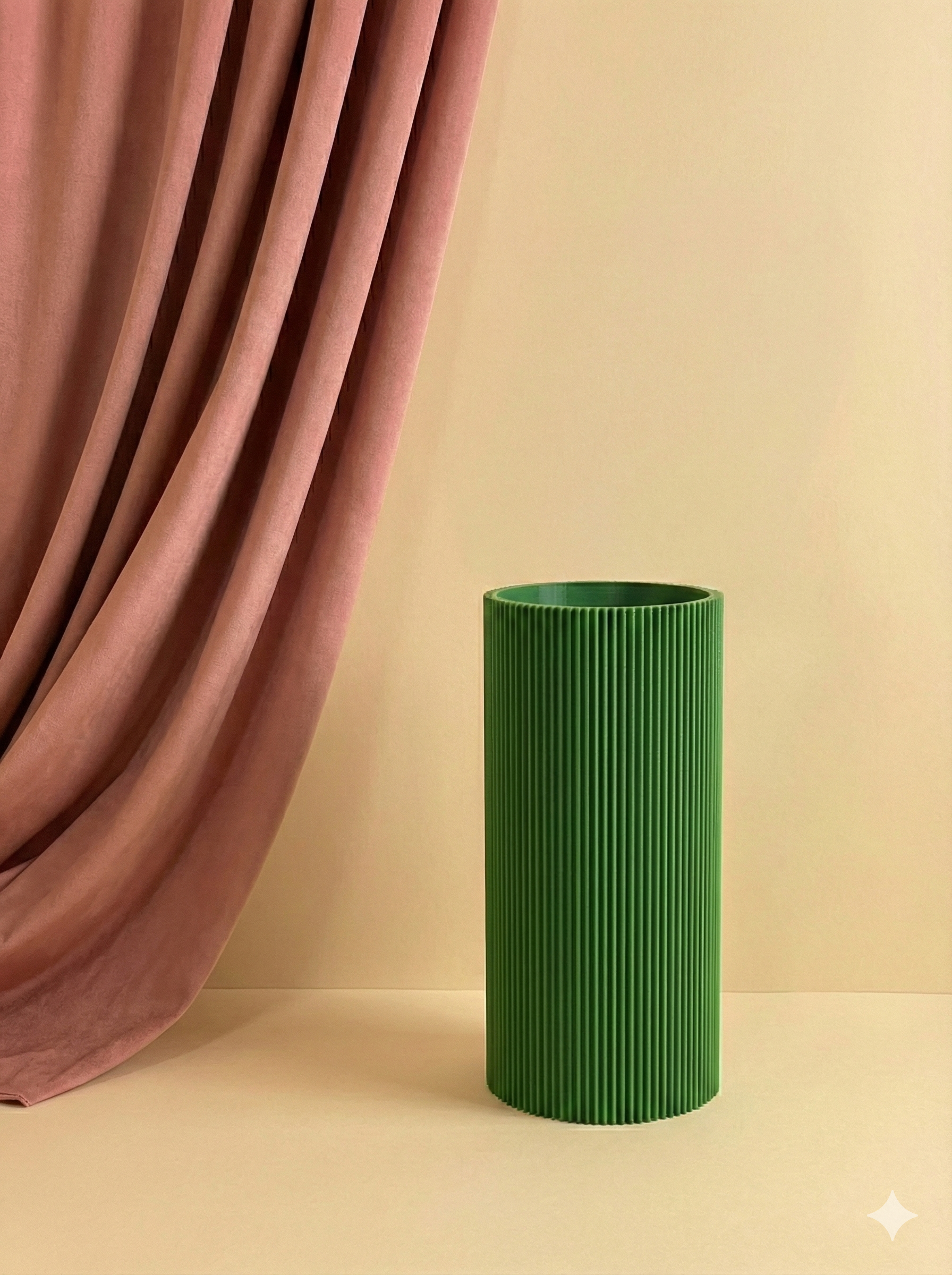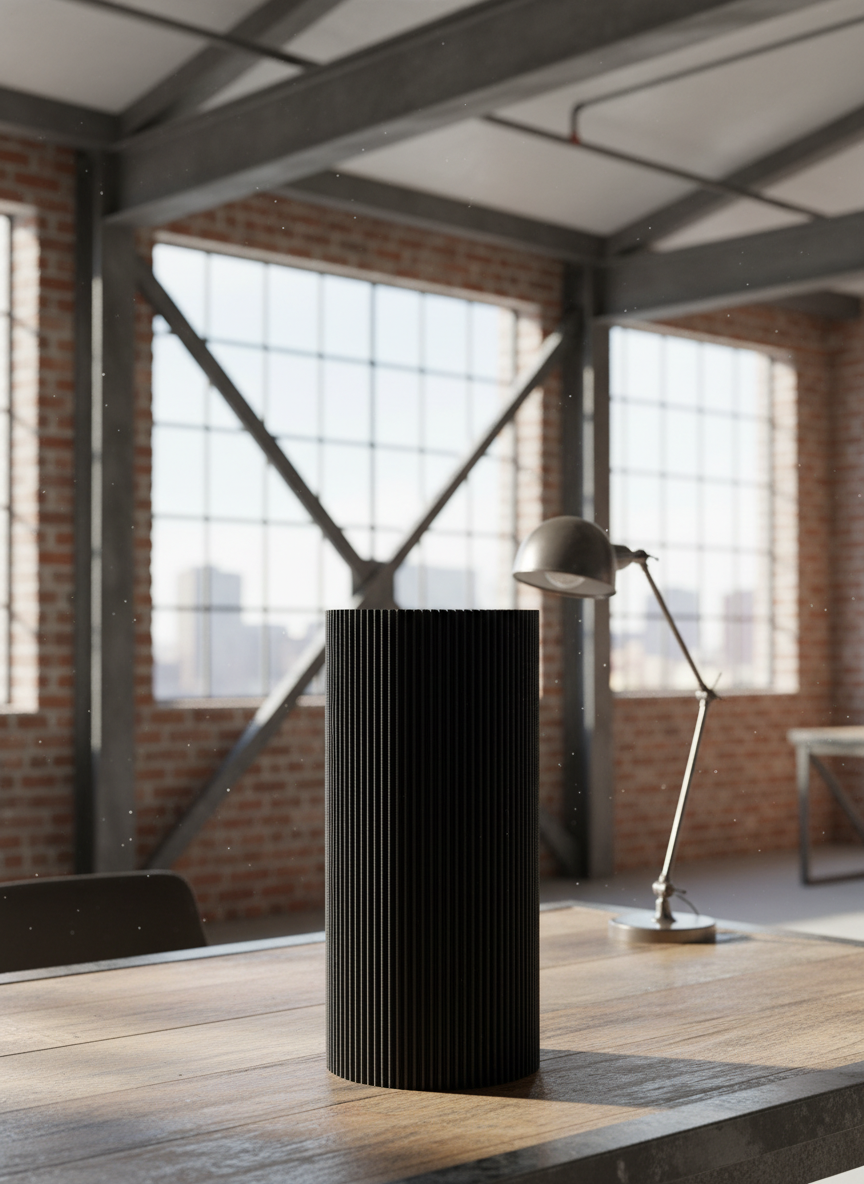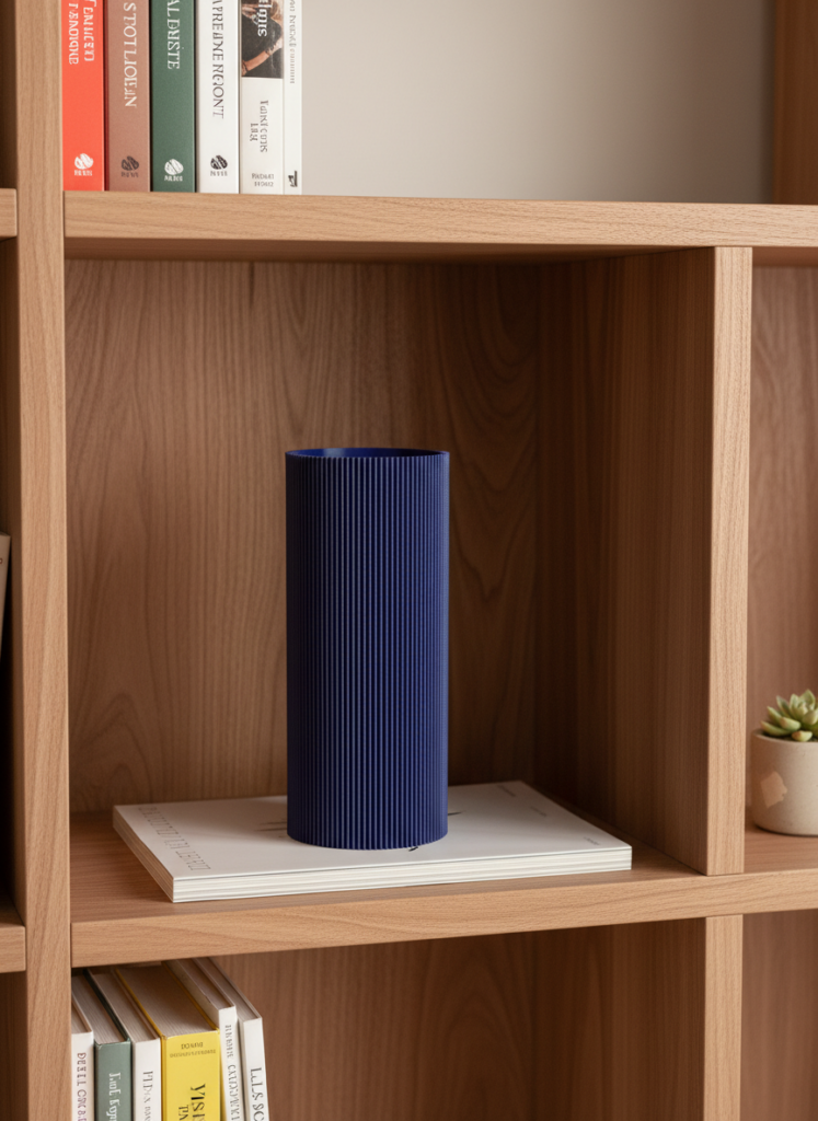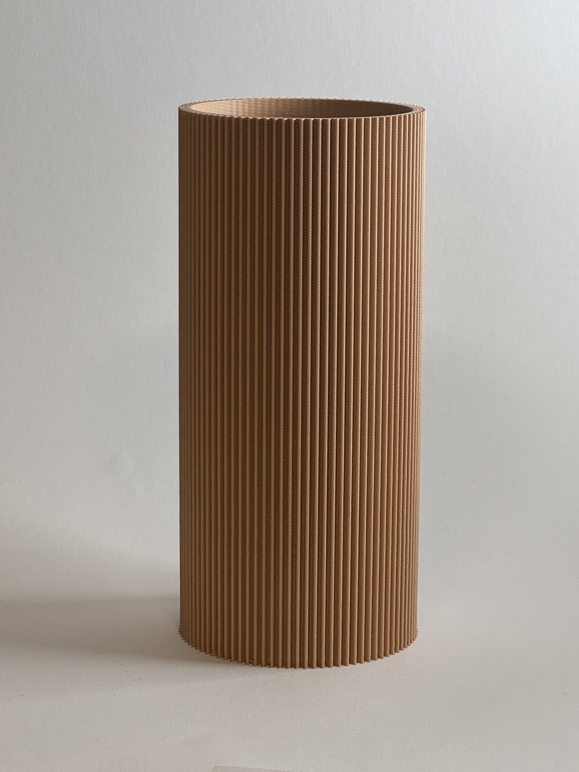 Die zylindrische Silhouette trifft auf eine fein geriffelte Oberfläche, die durch präzisen 3D Druck entsteht. Die sichtbaren Layer erzeugen eine elegante vertikale Struktur, die Licht und Schatten auf faszinierende Weise reflektiert.
